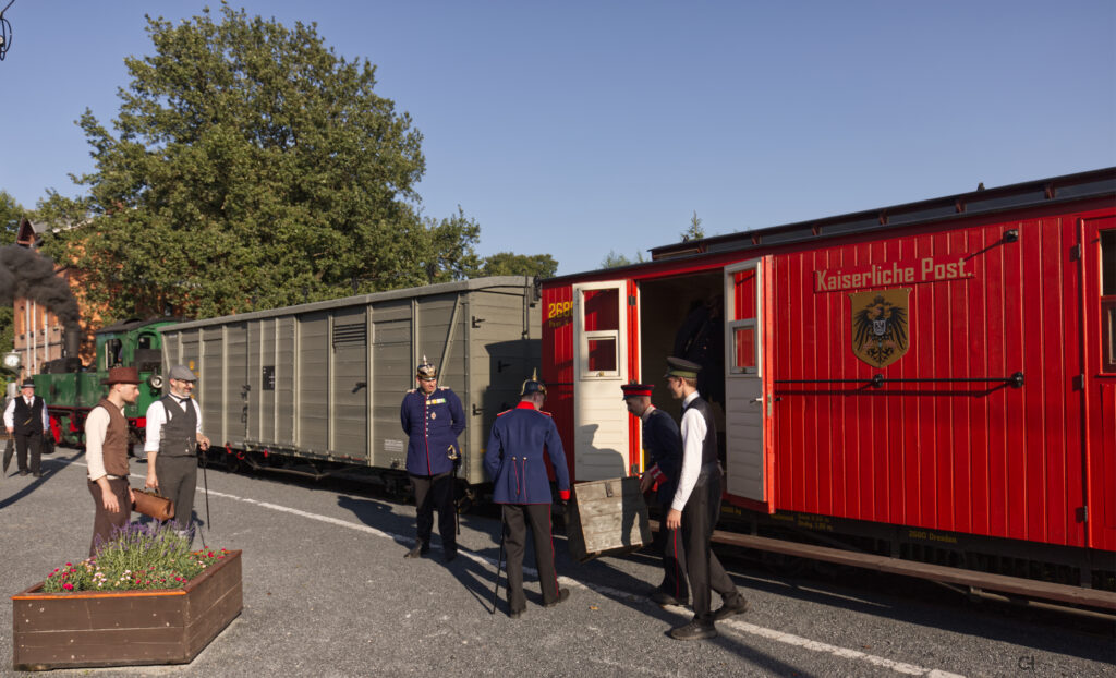 Auf große Fahrt geht es wie zu Zeiten der Königlich Sächsischen Staatseisenbahn in traditioneller Uniform und mit historischem Zug.