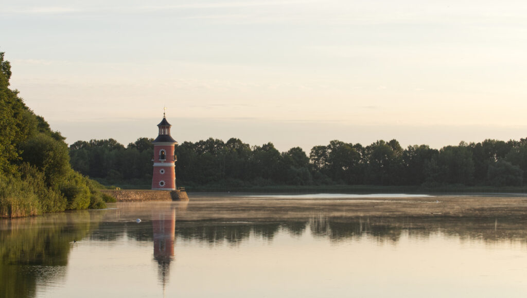 Am Großteich zwischen Bärnsdorf und Moritzburg entstand eine ganze Küstenlandschaft mit künstlichen Ruinen, einem Leuchtturm und einer Anlegestelle für Schiffe. Direkt daneben erhebt sich das Fasanenschlösschen, das kleinste Königsschloss in Sachsen.