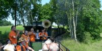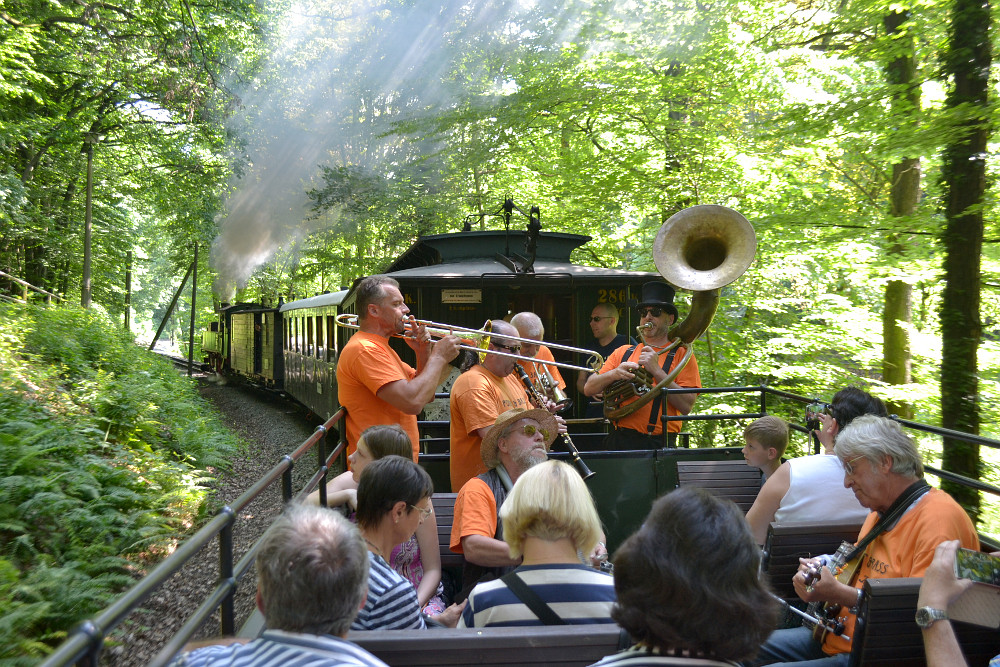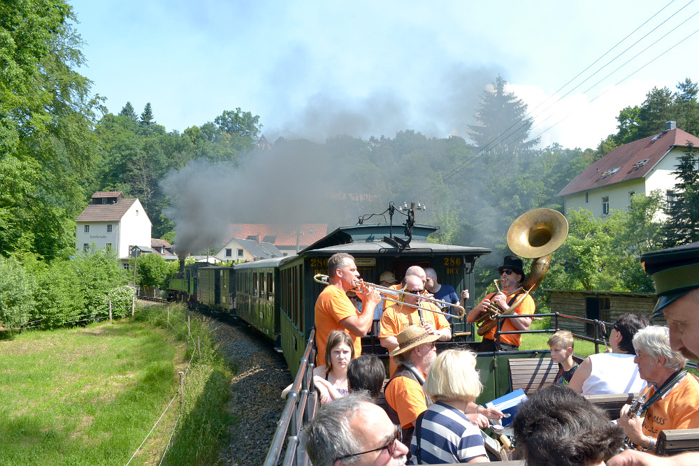 Zur Dixielandtour in den Sommer ging es mit dem Traditionszug nach Radeburg und zurück. Im Traditionszug hat die Dixie-Band Porky & Bass in den verschiedenen historischen Wagen gespielt und mit ihrer Live-Musik für eine tolle Stimmung gesorgt. Bei dem schönem Wetter befand sich auch ein Aussichtswagen im Zugverband, wo man die Zugfahrt, Klang und Geruch der Dampflokomotive und die musikalischen Klänge bei sommerlichen Temperaturen besonders gut genießen konnte. In Moritzburg und Radeburg wurde dann bei den Aufenthalten auf dem Bahnsteig musiziert und auch nach der Ankunft in Radebeul Ost wurde noch ein schöner Abschiedsreigen gespielt.